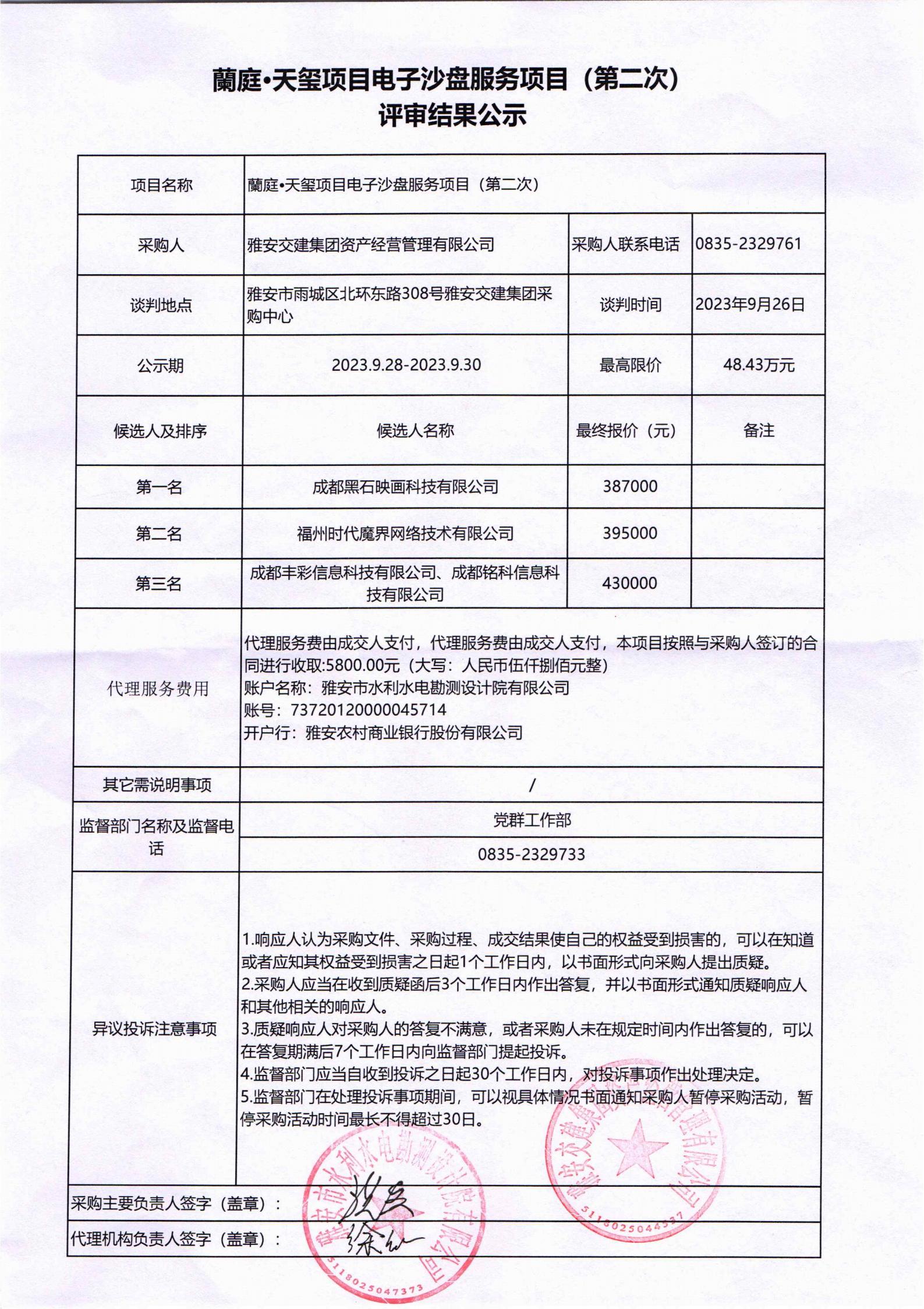雅安交建集團(tuán)資產(chǎn)經(jīng)營管理有限公司蘭庭•天璽項(xiàng)目電子沙盤服務(wù)項(xiàng)目(第二次)評審結(jié)果公示