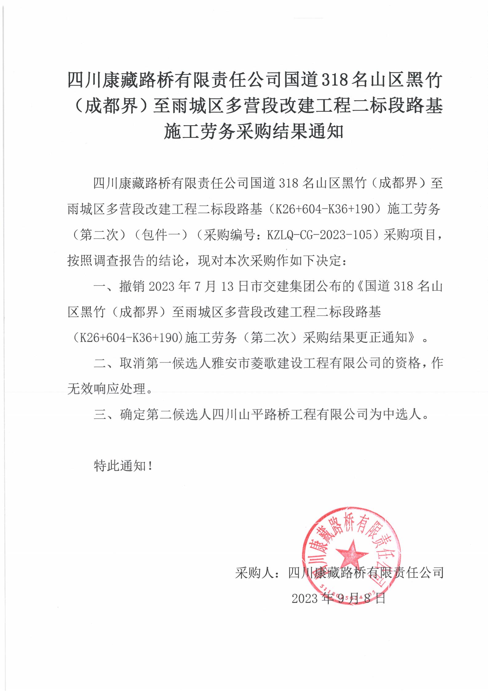 四川康藏路橋有限責任公司國道318名山區(qū)黑竹(成都界)至雨城區(qū)多營段改建工程二標段路基施工勞務采購結果通知