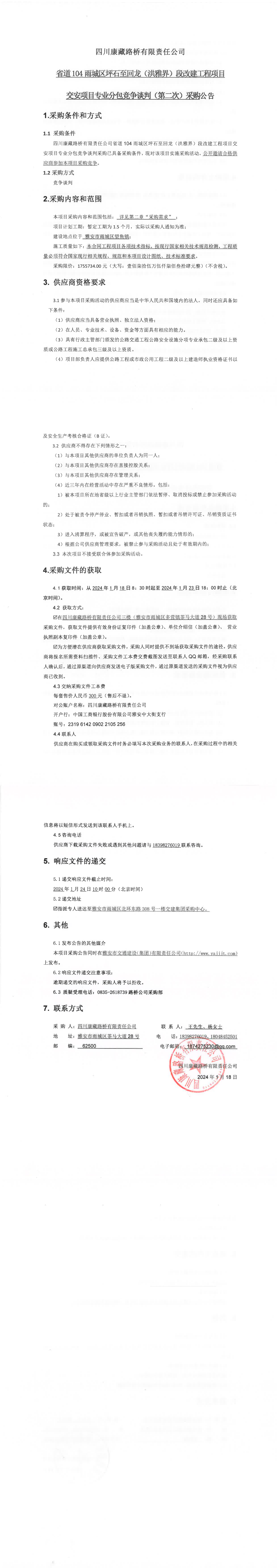 四川康藏路橋有限責任公司省道104雨城區(qū)坪石至回龍(洪雅界)段改建工程項目交安項目專業(yè)分包競爭談判(第二次)采購公告