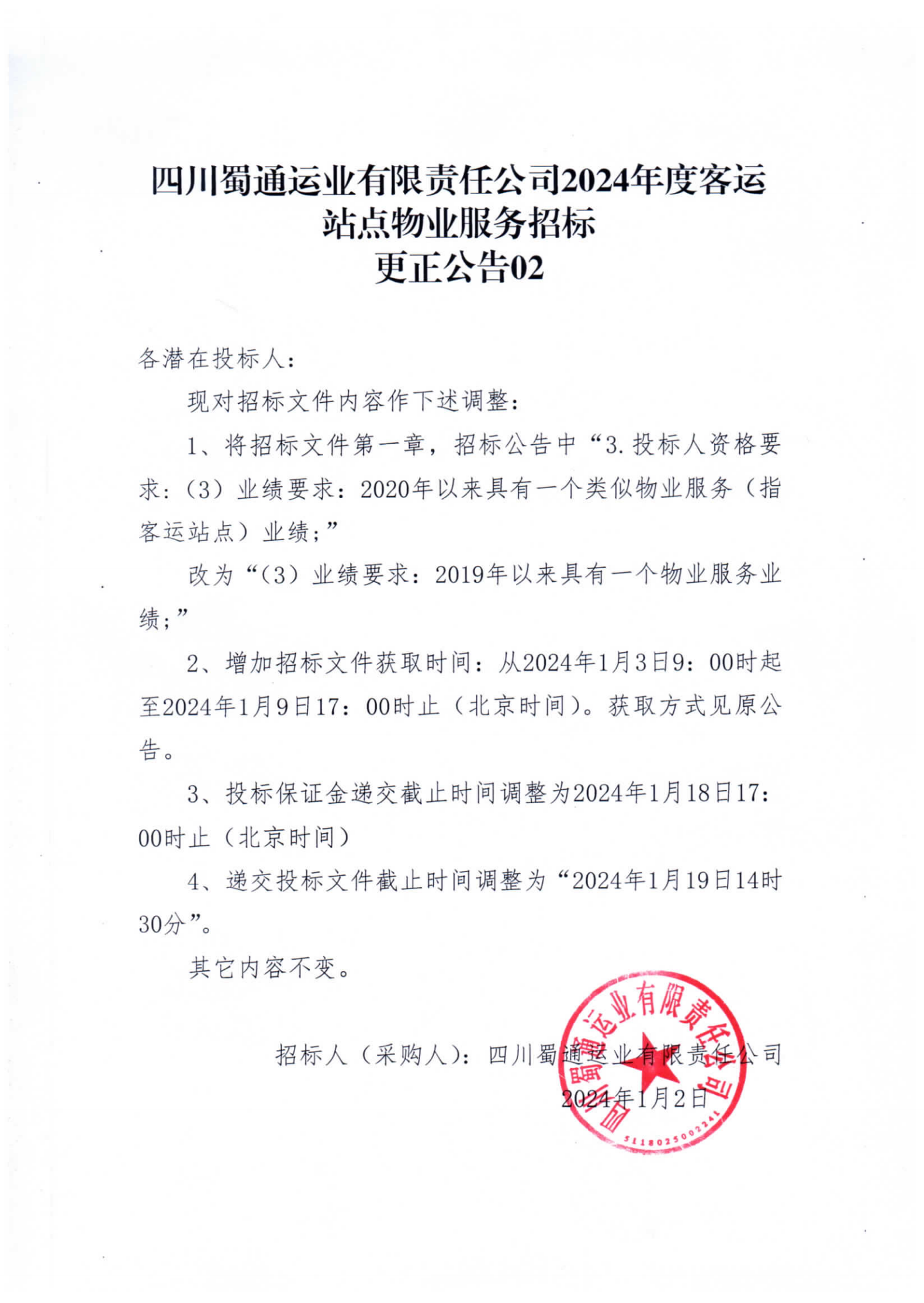 四川蜀通運業(yè)有限責任公司2024年度客運站點物業(yè)服務招標更正公告02
