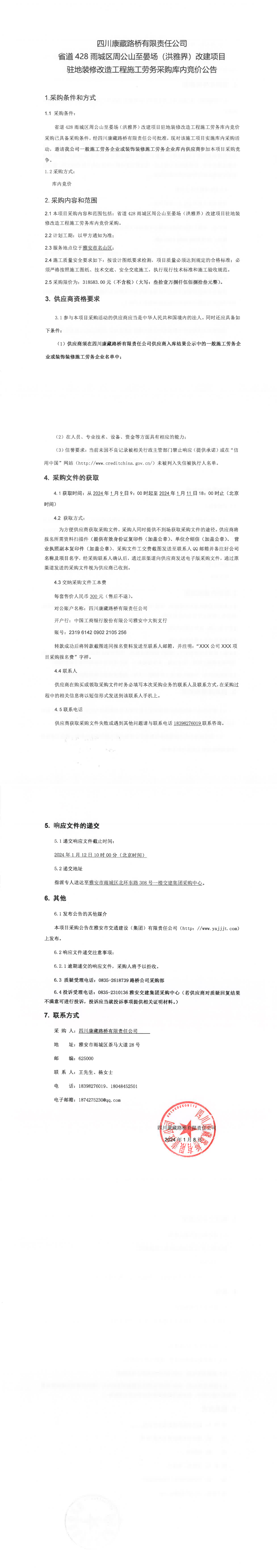 四川康藏路橋有限責(zé)任公司省道428雨城區(qū)周公山至晏場(洪雅界)改建項(xiàng)目駐地裝修改造工程施工勞務(wù)采購庫內(nèi)競價(jià)公告