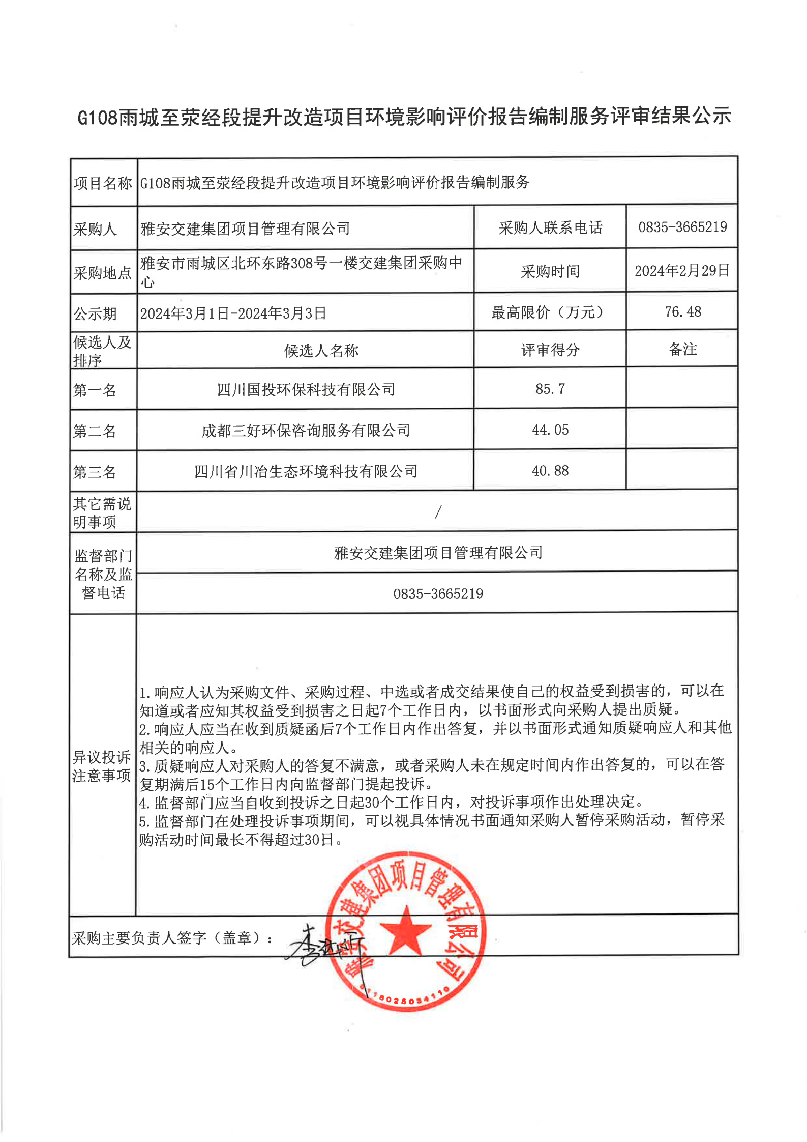 雅安交建集團(tuán)項(xiàng)目管理有限公司G108雨城至滎經(jīng)段提升改造項(xiàng)目環(huán)境影響評(píng)價(jià)報(bào)告編制服務(wù)評(píng)審結(jié)果公示