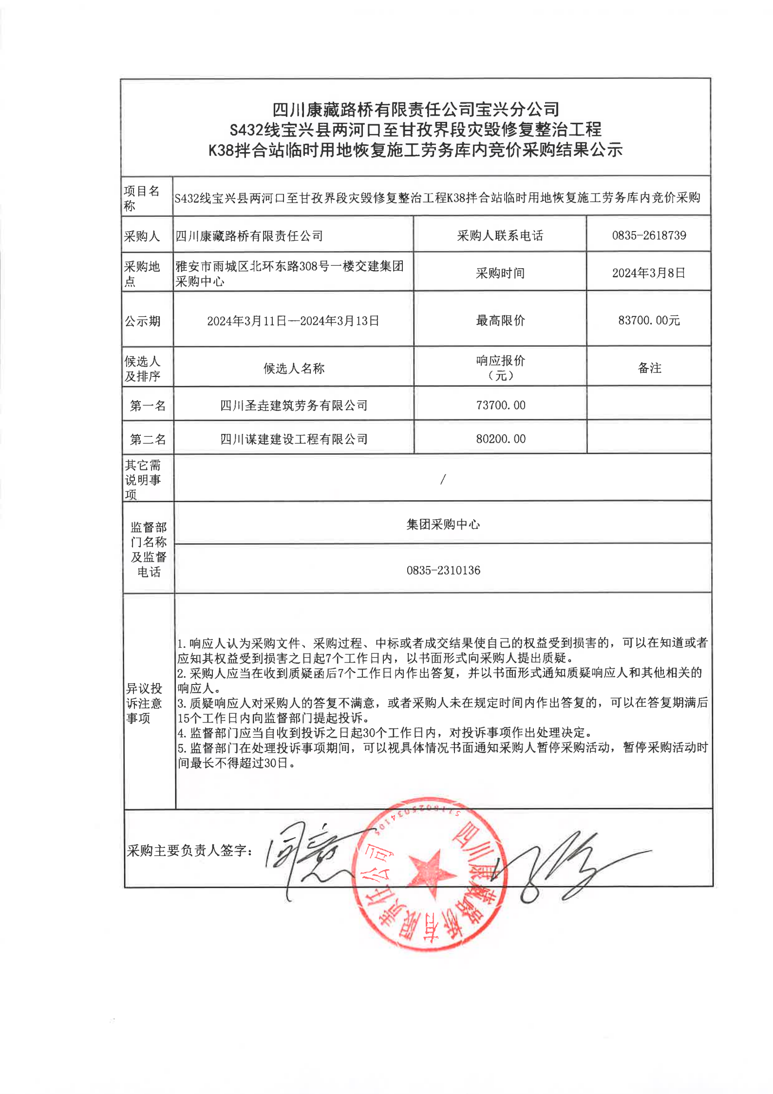 四川康藏路橋有限責(zé)任公司寶興分公司S432線寶興縣兩河口至甘孜界段災(zāi)毀修復(fù)整治工程K10棄土場(chǎng)施工勞務(wù)庫內(nèi)采購結(jié)果公示