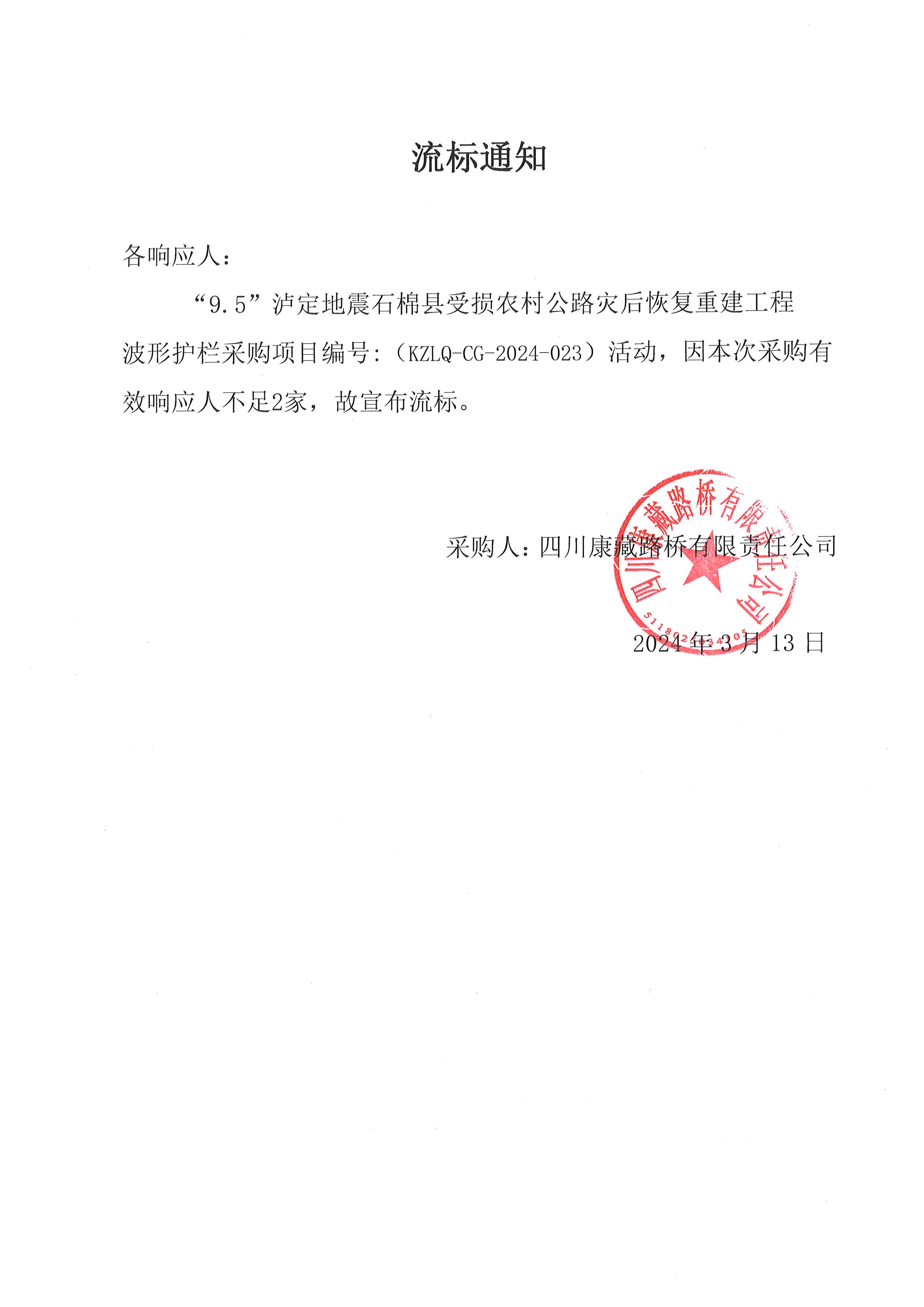 四川康藏路橋有限責(zé)任公司“9.5”瀘定地震石棉縣受損農(nóng)村公路災(zāi)后恢復(fù)重建工程波形護(hù)欄采購流標(biāo)通知