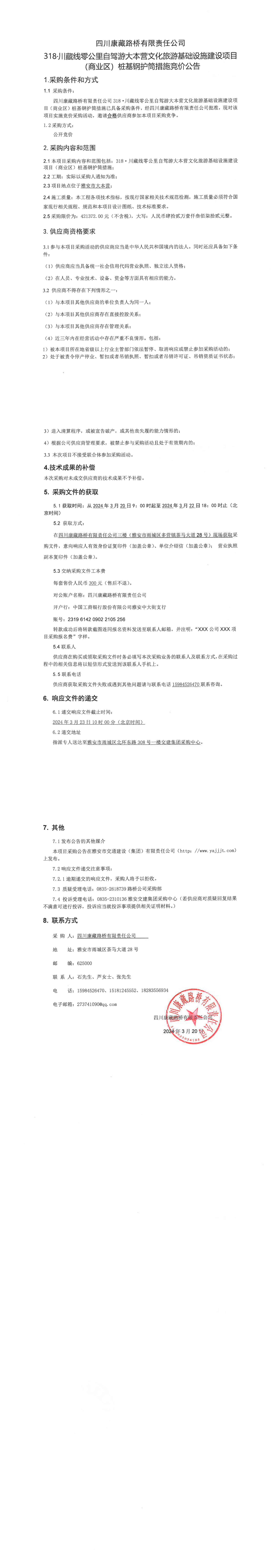 四川康藏路橋有限責(zé)任公司318·川藏公路零公里自駕游大本營文化旅游基礎(chǔ)設(shè)施建設(shè)項目(商業(yè)區(qū))樁基鋼護(hù)筒措施競價公告