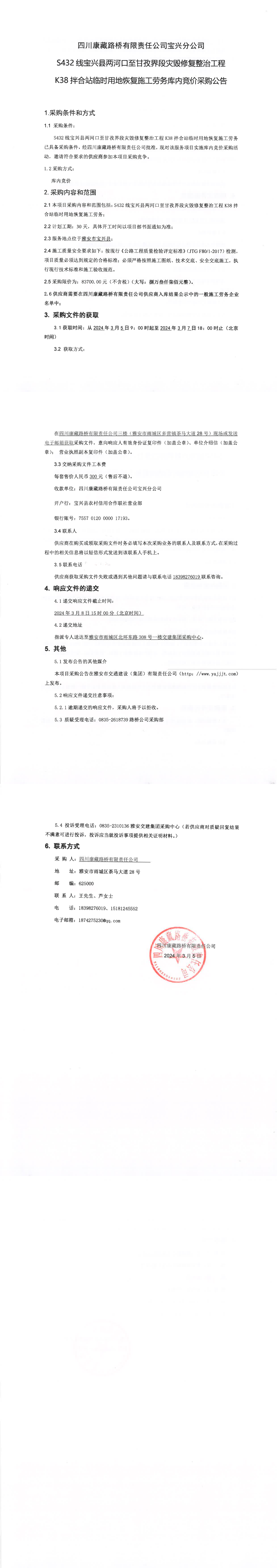 四川康藏路橋有限責(zé)任公司S432線寶興縣兩河口至甘孜界段災(zāi)毀修復(fù)整治工程K38拌合站臨時(shí)用地恢復(fù)施工勞務(wù)庫內(nèi)競價(jià)采購公告