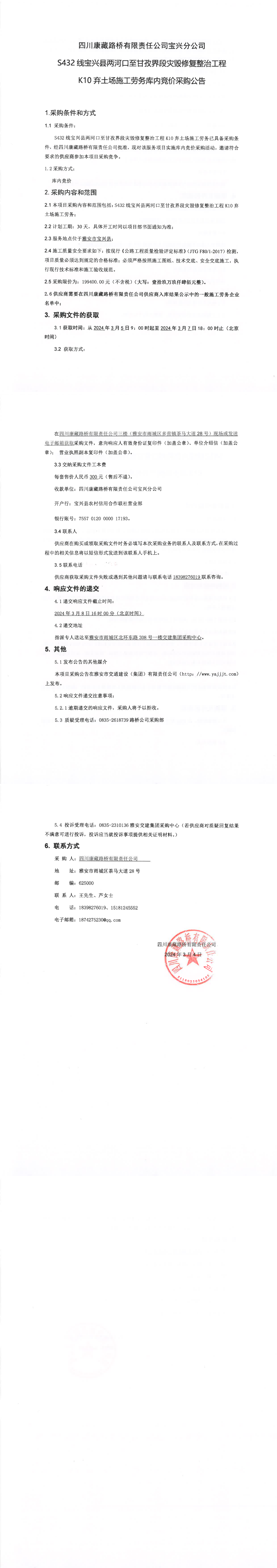 四川康藏路橋有限責(zé)任公司S432線寶興縣兩河口至甘孜界段災(zāi)毀修復(fù)整治工程K10棄土場施工勞務(wù)庫內(nèi)競價采購公告