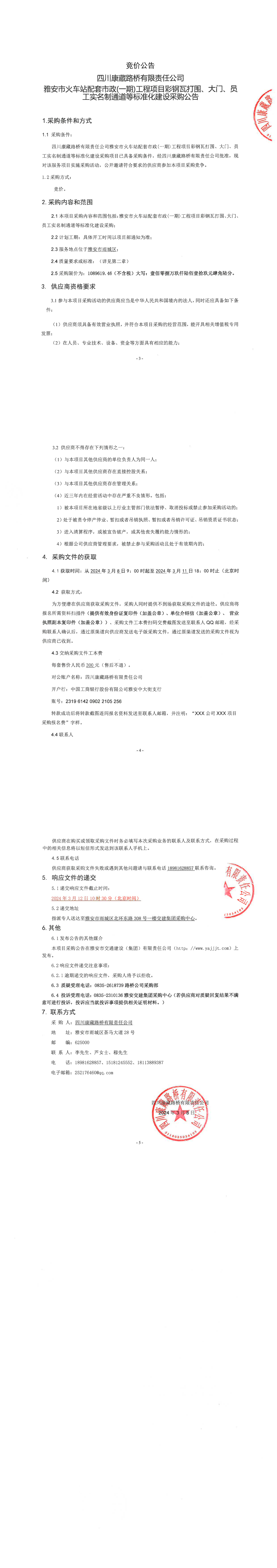 四川康藏路橋有限責任公司雅安市火車站配套市政(一期)工程項目彩鋼瓦打圍、大門、員工實名制通道等標準化建設采購公告