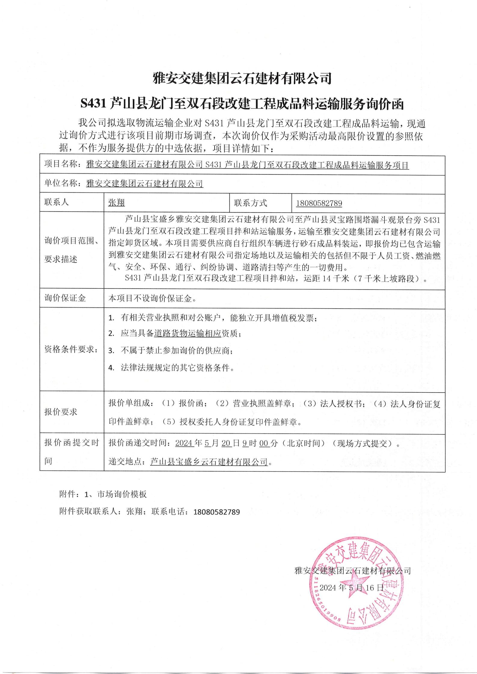 雅安交建集團(tuán)云石建材有限公司S431蘆山縣龍門至雙石段改建工程成品料運(yùn)輸服務(wù)項(xiàng)目詢價(jià)函