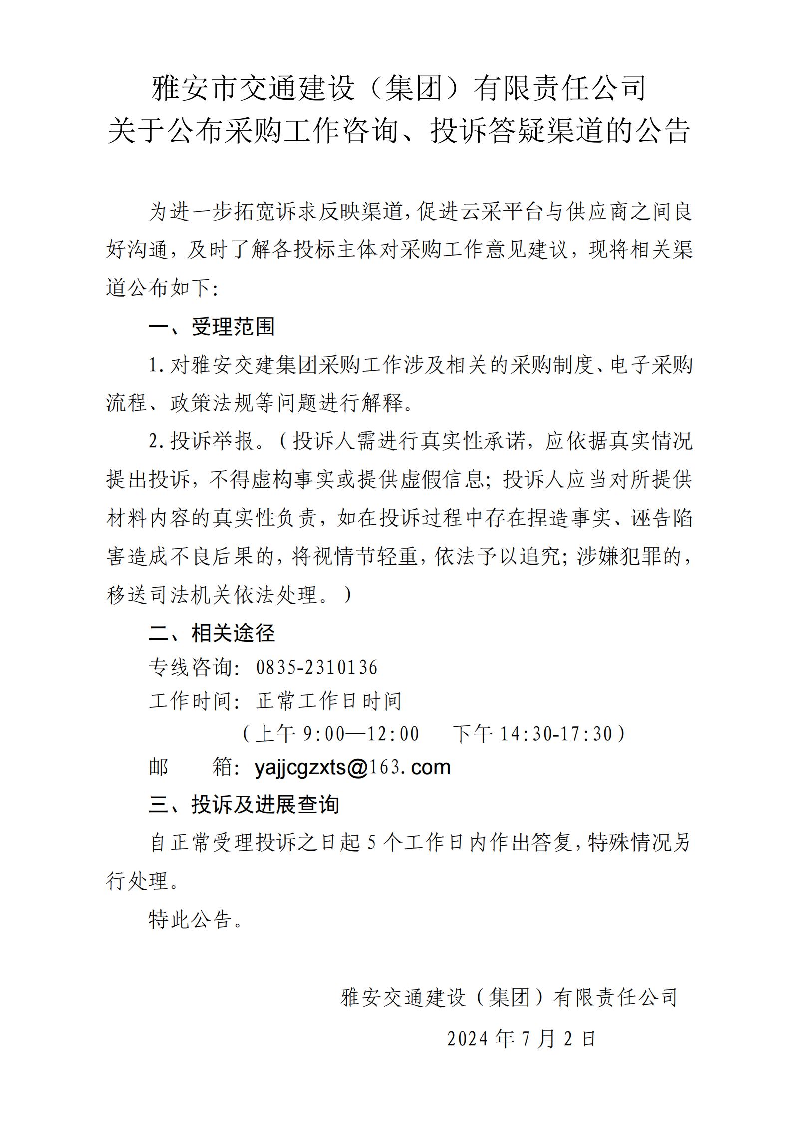 雅安市交通建設(shè)(集團)有限責(zé)任公司關(guān)于公布采購工作咨詢、投訴答疑渠道的公告