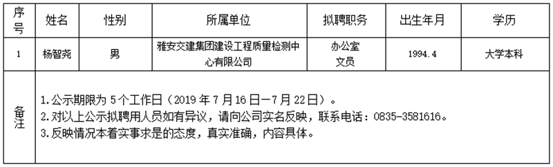 雅安交建集團(tuán)子公司擬聘用人員公示(工程質(zhì)量檢測(cè)中心)