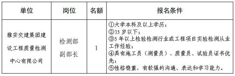 根據(jù)發(fā)展需要,決定面向社會公開招聘雅安市交通建設(shè)(集團)有限責(zé)任公司(以下簡稱“雅安交建集團”)所屬子公司中層干部1名,現(xiàn)將有關(guān)事項公告如下: