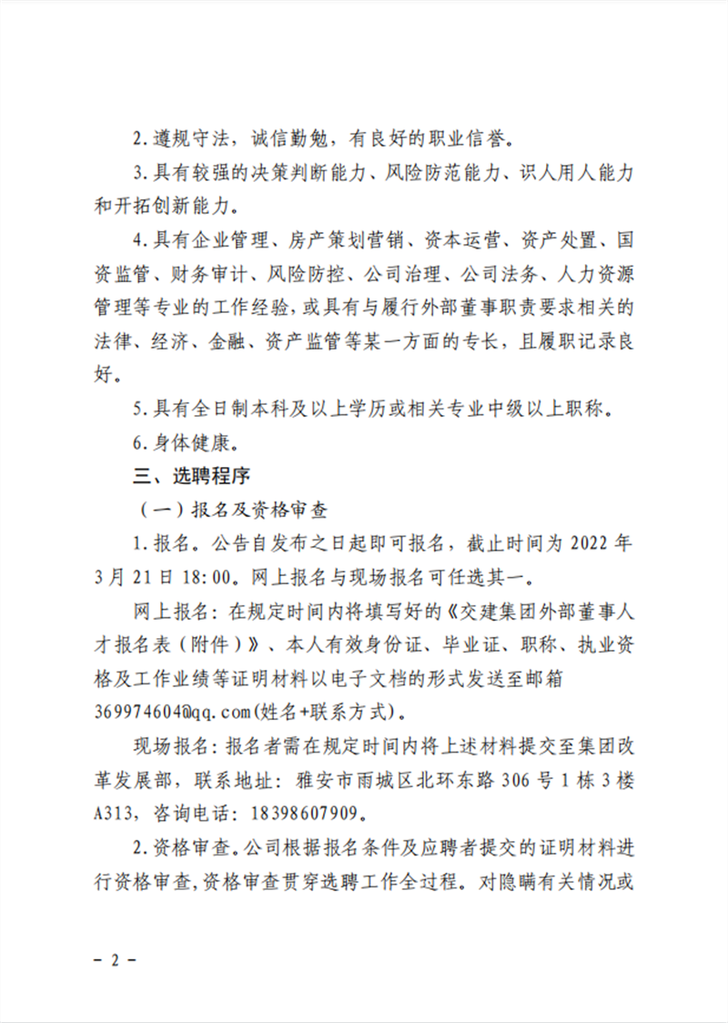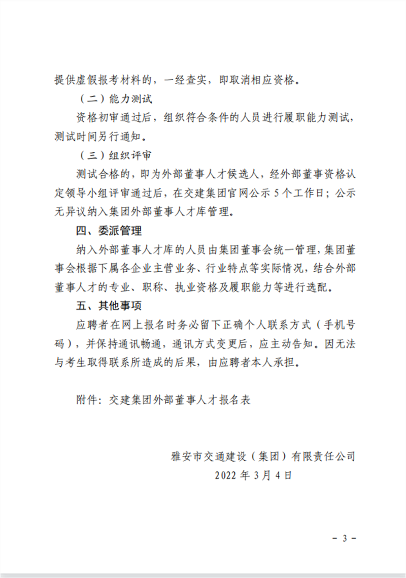 雅安交通建設(集團)有限責任公司 關于建立外部董事人才庫的公告
