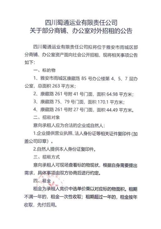 四川蜀通運(yùn)業(yè)有限責(zé)任公司關(guān)于部分商鋪、辦公室對外招租的公告