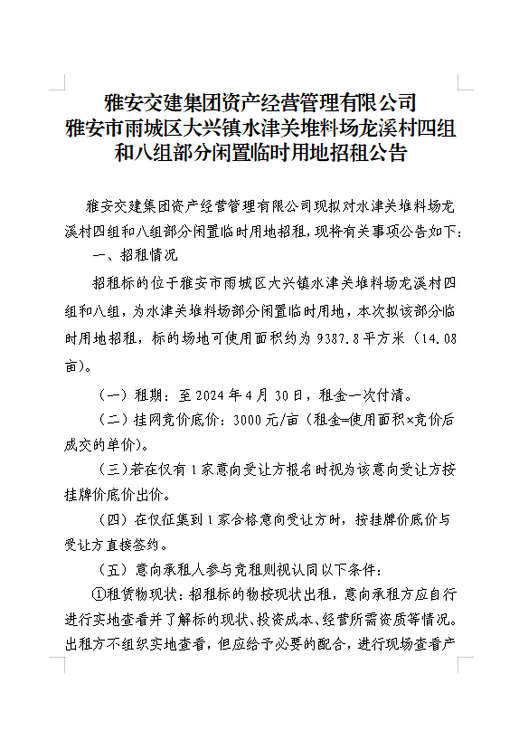 雅安交建集團資產(chǎn)經(jīng)營管理有限公司雨城區(qū)大興鎮(zhèn)水津關(guān)堆料場龍溪村四組和八組部分閑置臨時用地招租公告