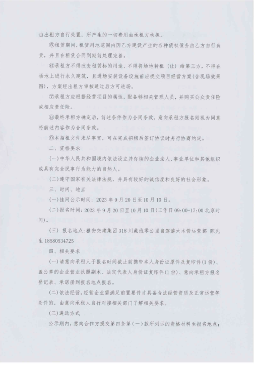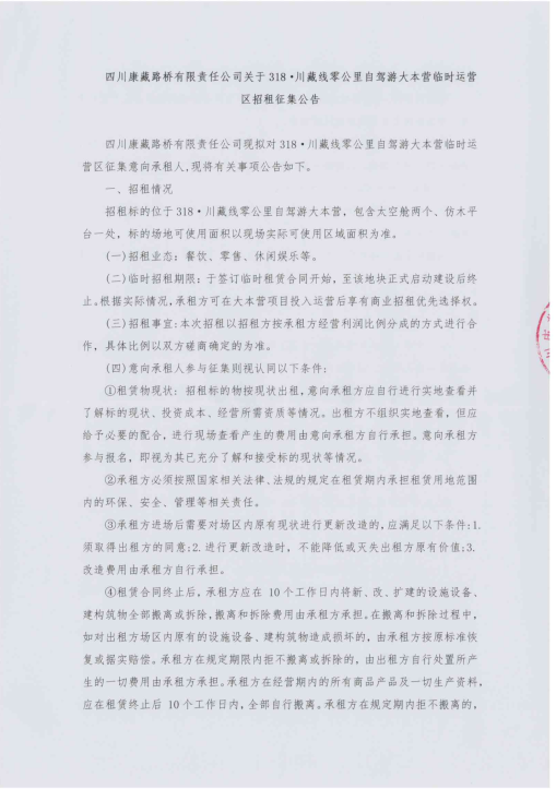 四川康藏路橋有限責(zé)任公司318·川藏線(xiàn)零公里自駕游大本營(yíng)臨時(shí)用地臨時(shí)招租征集公告