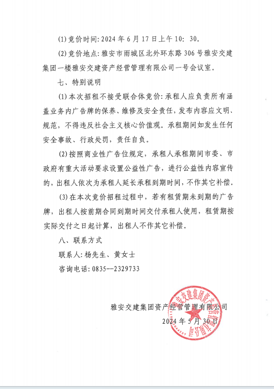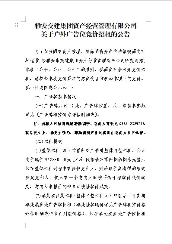 雅安交建集團資產經(jīng)營管理有限公司關于戶外廣告位競價招租的公告