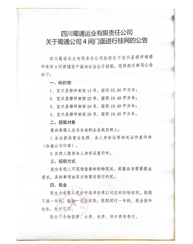 四川蜀通運(yùn)業(yè)有限責(zé)任公司關(guān)于蜀通公司4間門面進(jìn)行掛網(wǎng)的公告