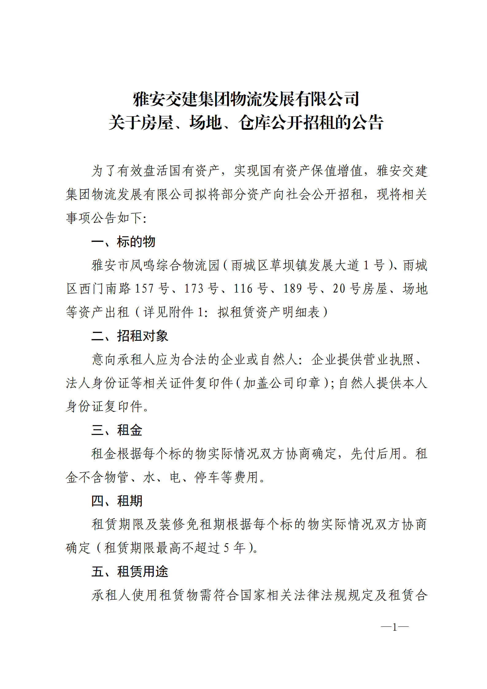 雅安交建集團(tuán)物流發(fā)展有限公司 關(guān)于房屋、場(chǎng)地、倉(cāng)庫(kù)公開(kāi)招租的公告