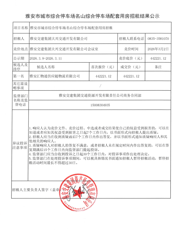 雅安市城市綜合停車場名山綜合停車場配套用房招租結(jié)果公示