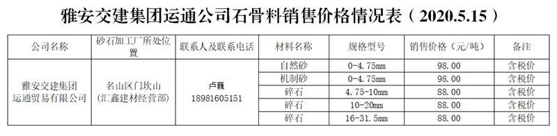 運(yùn)通貿(mào)易有限公司。運(yùn)通公司是雅安市交通建設(shè)(集團(tuán))有限責(zé)任公司獨(dú)資子公司,主要負(fù)責(zé)雨城區(qū)中心城區(qū)河道外砂石經(jīng)營管理工作。目前,公司與名山區(qū)匯鑫建材經(jīng)營部確定了代加工合作關(guān)系,已投產(chǎn),預(yù)計(jì)年生產(chǎn)能力約30萬噸。