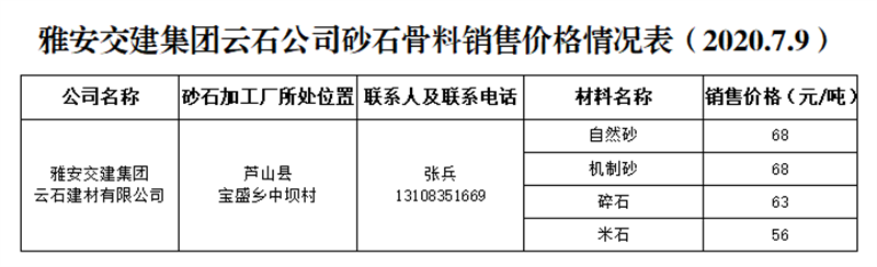 雅安交建集團(tuán)云石公司砂石骨料銷售價(jià)格情況表(2020.7.9)