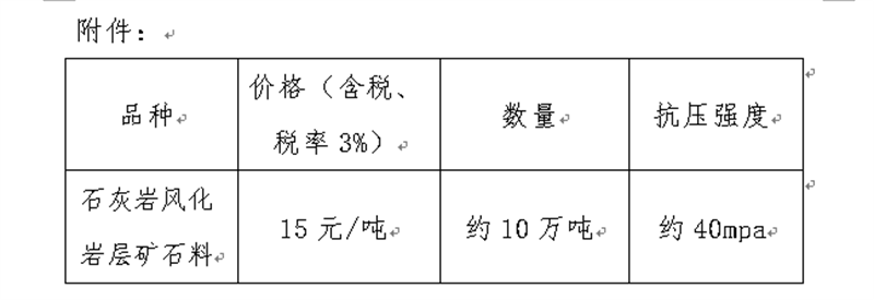 現(xiàn)將我公司礦山首采平臺(tái)的石灰?guī)r風(fēng)化巖層礦石料定價(jià)出售事宜進(jìn)行公示(見(jiàn)附件),經(jīng)公司研究決定,定價(jià)出售風(fēng)化巖層礦石料約10萬(wàn)噸,現(xiàn)通過(guò)集團(tuán)公司官網(wǎng)信息公示后對(duì)外銷(xiāo)售。報(bào)名客戶數(shù)不限,銷(xiāo)售方式為先款后貨,簽約銷(xiāo)售,銷(xiāo)售時(shí)間以礦山開(kāi)采和生產(chǎn)計(jì)劃為準(zhǔn)。