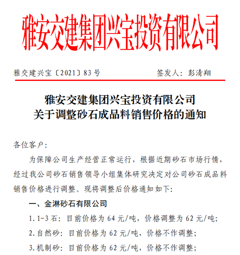 雅安交建集團興寶公司關(guān)于調(diào)整成品料銷售價格的通知(2021.11.23)