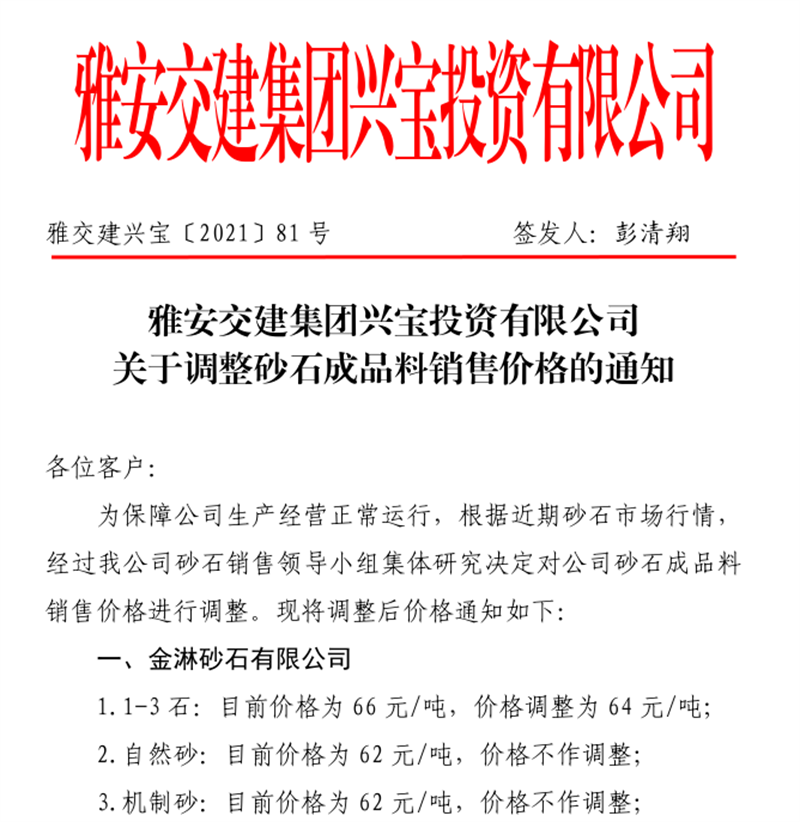 雅安交建集團(tuán)云石公司關(guān)于調(diào)整成品料銷售價(jià)格的通知(2021.11.4)