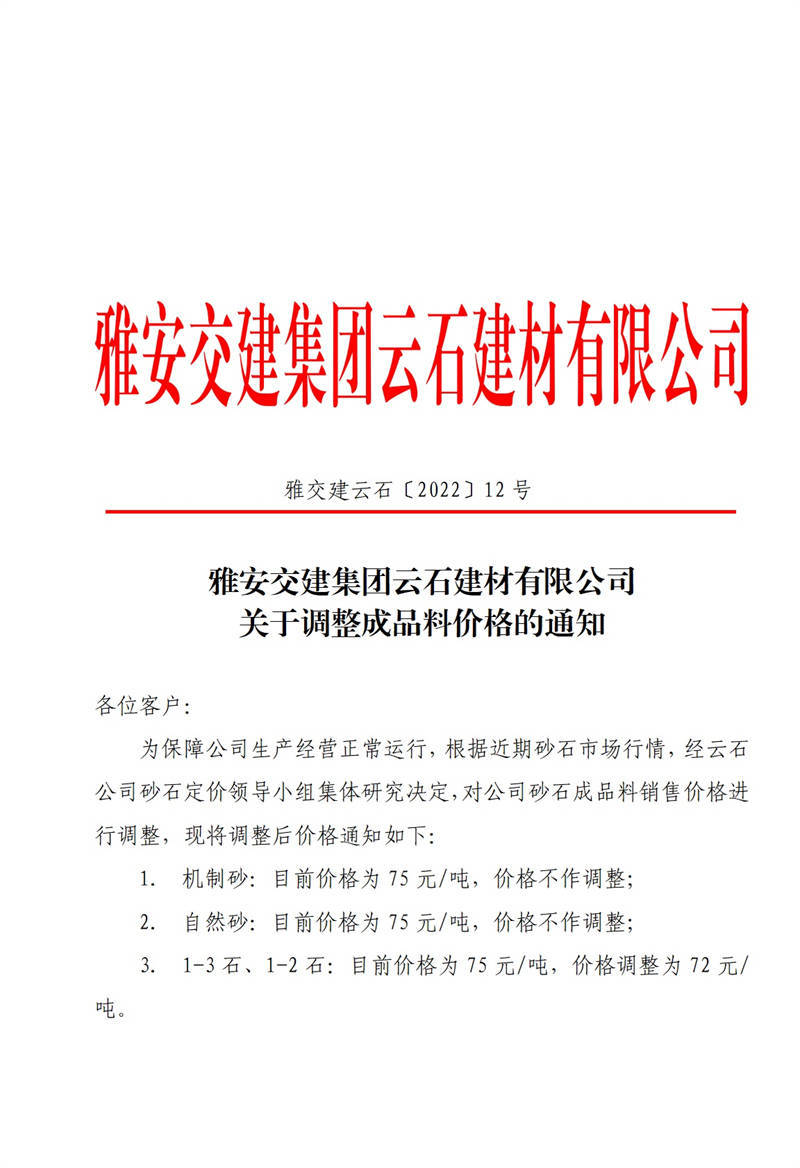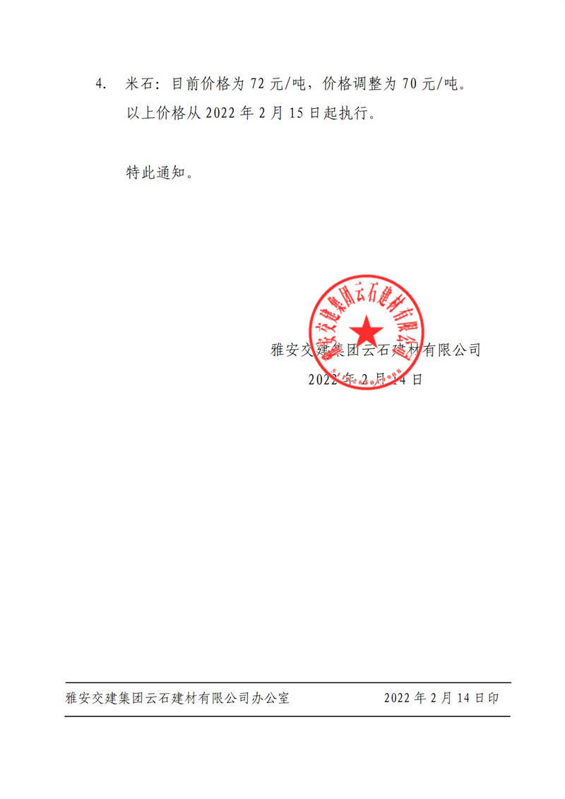 ÑŰ²½»½¨¼¯ˆFÔÆÊ¯½¨²ÄÓÐÏÞ¹«Ë¾êP(gu¨¡n)ÓÚÕ{(di¨¤o)Õû³ÉÆ·Áσr¸ñµÄ֪ͨ£¨2022-2-14£©