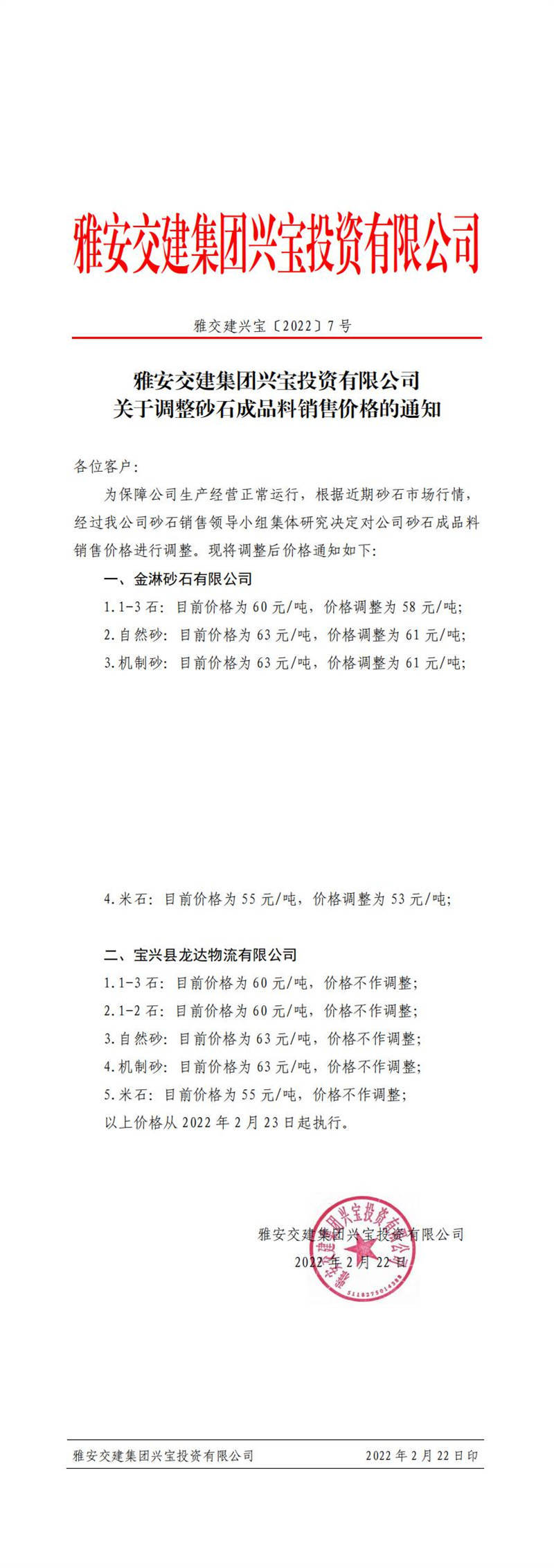 ÑŰ²½»½¨¼¯ˆF(tu¨¢n)ÅdŒšÍ¶ÙYÓÐÏÞ¹«Ë¾ êP(gu¨¡n)ÓÚÕ{(di¨¤o)Õûɰʯ³ÉÆ·ÁÏäNÊÛƒr¸ñµÄ֪ͨ£¨2022-2-23£©