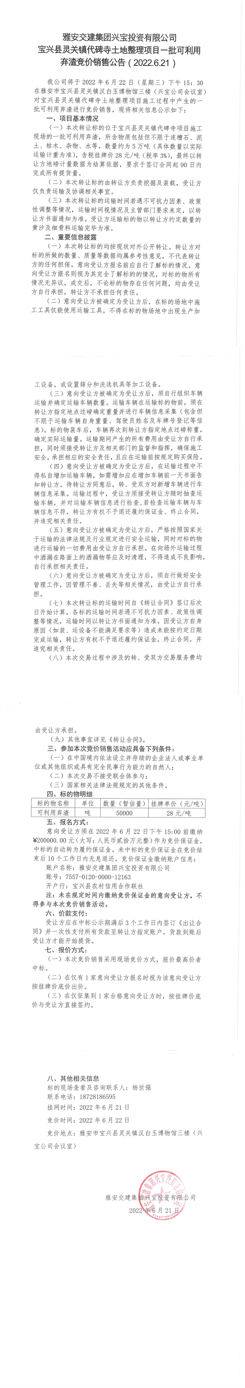 雅安交建集團興寶投資有限公司寶興縣靈關鎮(zhèn)代碑寺土地整理項目-批可利用 棄渣競價銷售公告( 2022.6.21)