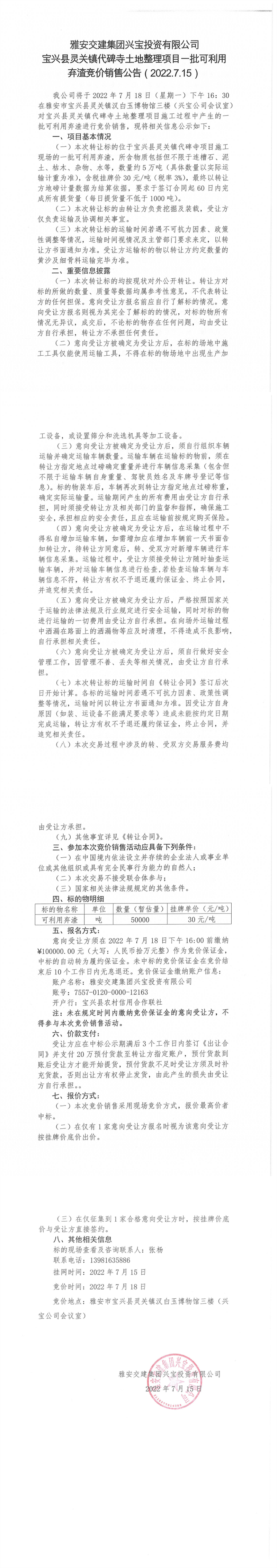 寶興縣靈關(guān)鎮(zhèn)代碑寺土地整理項目一批可利用棄渣競價銷售公告7.18(5萬噸)