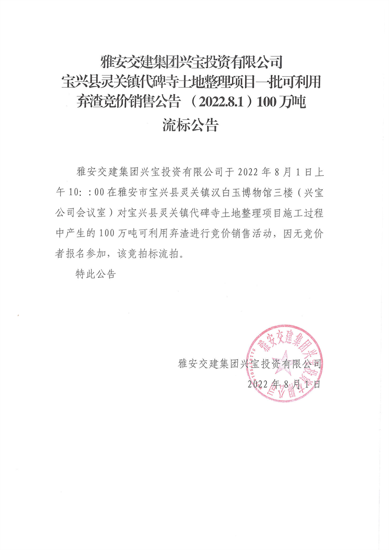雅安交建集團興寶投資有限公司靈關鎮(zhèn)代碑寺土地整理項目100萬噸可利用棄渣競價銷售流標公告(2022.8.1)