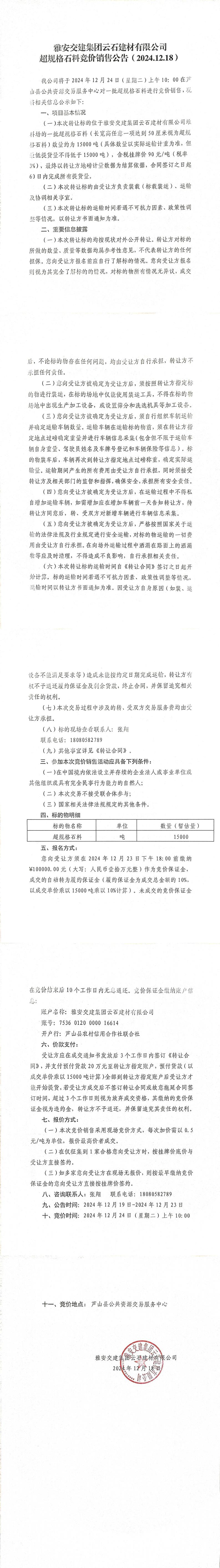 ÑŰ²½»½¨¼¯ˆFÔÆÊ¯½¨²ÄÓÐÏÞ¹«Ë¾³¬ÒŽ(gu¨©)¸ñʯƷÁϸ‚ƒräNÊÛ¹«¸æ£¨2024-12-19£©