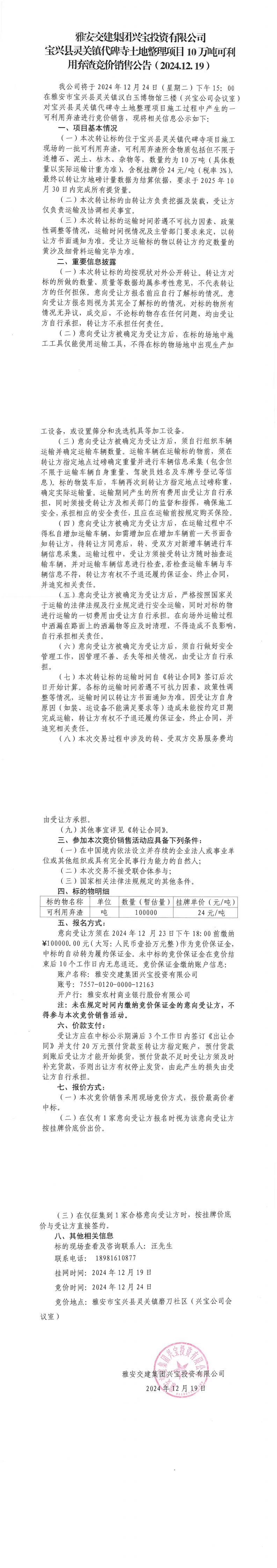 雅安交建集團(tuán)興寶投資有限公司靈關(guān)鎮(zhèn)代碑寺土地整理項(xiàng)目5萬噸可利用棄渣競價銷售公告(2024.12.19)